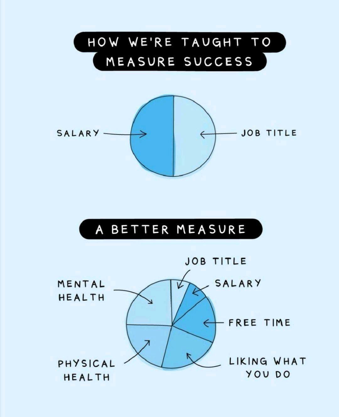 An infographic that challenges how we measure success has done the rounds on social media, which shows two pie charts. One, titled, How We’re Taught to Measure Success, is split in half with equal weight given to Salary and Job Title.
